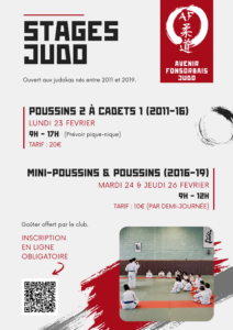 Pour participer à un ou plusieurs jours de stage, merci d’inscrire votre enfant et de procéder au règlement sur notre billetterie en ligne, avant le 8 février : Inscription-Stage-afjudo-hiver-2026